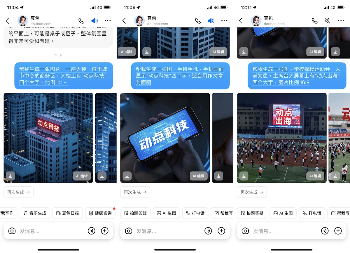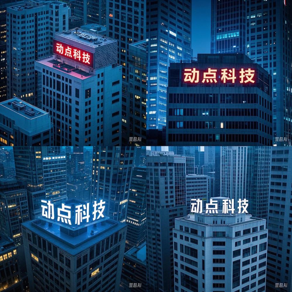 咱们测验让豆包生成市中心商务区大楼相片,大楼上方有“动点科技”四个大字。一次性给出的四张图片根本都契合预期。