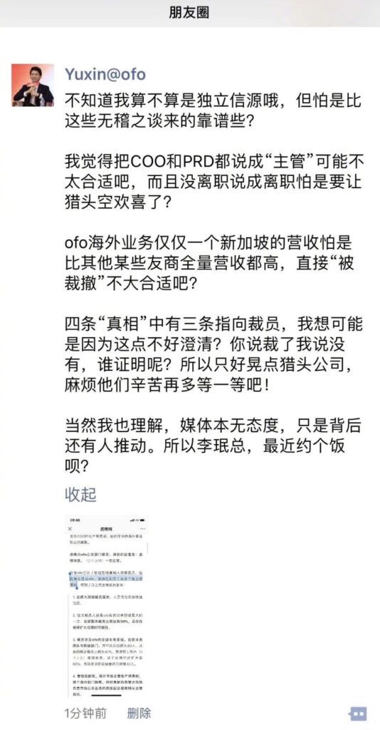 于信在朋友圈发贴表明,“ofo 海外事务只是一个新加坡的营收怕是比其他某些友商全量营收都高,直接‘被裁撤’不大适宜吧?”